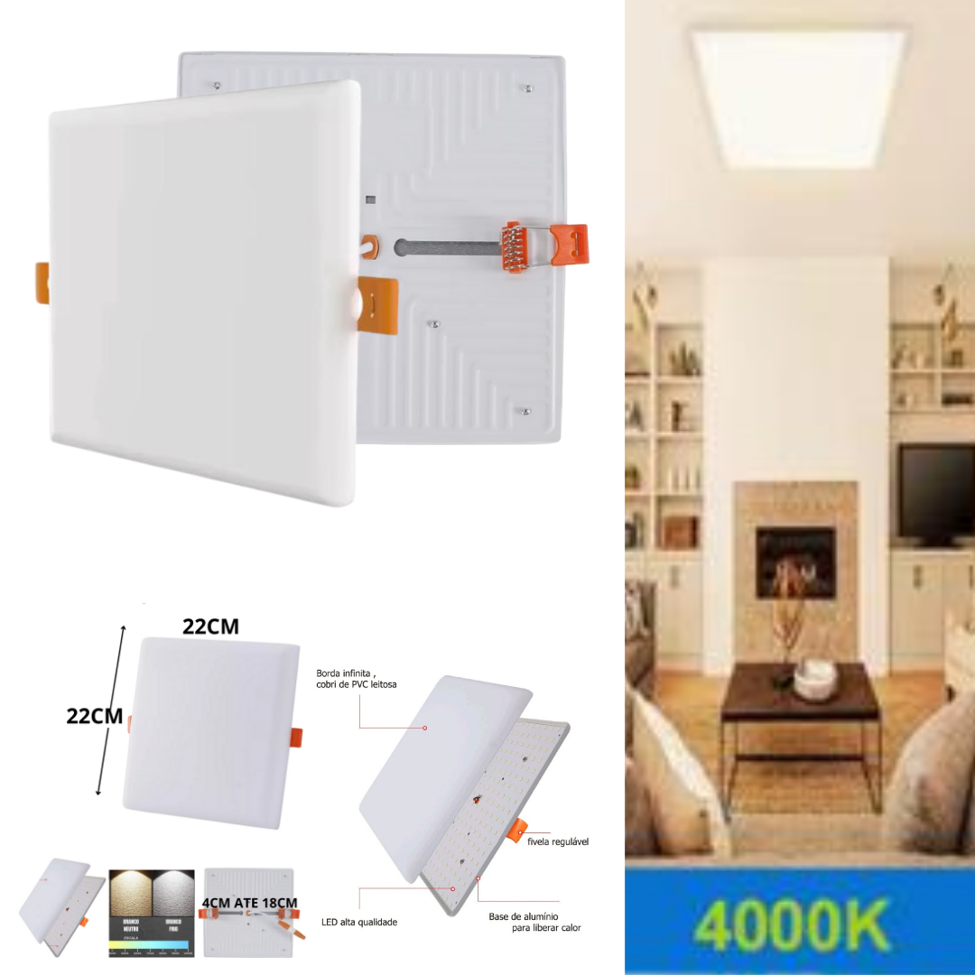 Plafon Led Borda Infinita 38w Embutir Quadrado 22cmx22cm Bivolt 98v-220v Neutro 4000K Primerio linha com 100% led de lumen 3300lm